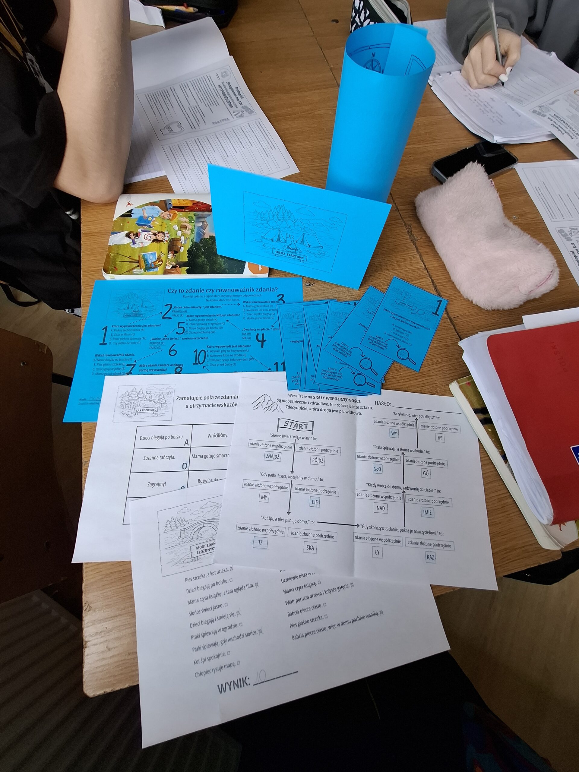 - Rozsypanka – 30 równoważników zdań, 25 zdań pojedynczych nierozwiniętych, 25 zdań pojedynczych rozwiniętych, 25 zdań złożonych, 15 zdań złożonych współrzędnie i 15 złożonych podrzędnie, 20 zdań złożonych z imiesłowowym równoważnikiem zdania.